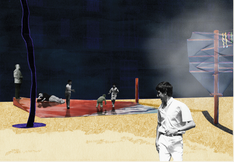 Our vision of 2068 encompasses a parsimonious attitude, grounded in resource sharing, respect for the environment, and a strong sense of community. Public space will have to make compromises for climate change and pollution: atmospheric, visual, and sonic. Therefore, the place is designed around water, which we take from the air and we offer back in a ritual-like gesture. Mesh-made water collectors take the humidity of the air through condensation and drawn it to a well. Overshadowing this well, a dislocated tectonic platform, covered by an ever-flowing membrane of the cold water underneath, cools the surrounding air. When people walk on the surface, their footsteps resonate as if echoes from the bell tower. The reflection of the bell is seen on the surface of the platform. The pillars that support the water collectors are joined by cables from which all kinds of wind chimes made by the community will hang. The public space thus becomes a shared playground that emphasises a collective sense of belonging as well as a sort of animism in the symbolic natural sounds of water and wind flow.